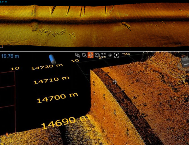 High-resolution side scan sonar surveys deliver detailed seafloor imagery, enabling the identification of submerged infrastructure, wrecks, debris, scour zones, and anchor hazards. Data is georeferenced with RTK GPS for precise positioning and integrated with bathymetric charts and GIS.